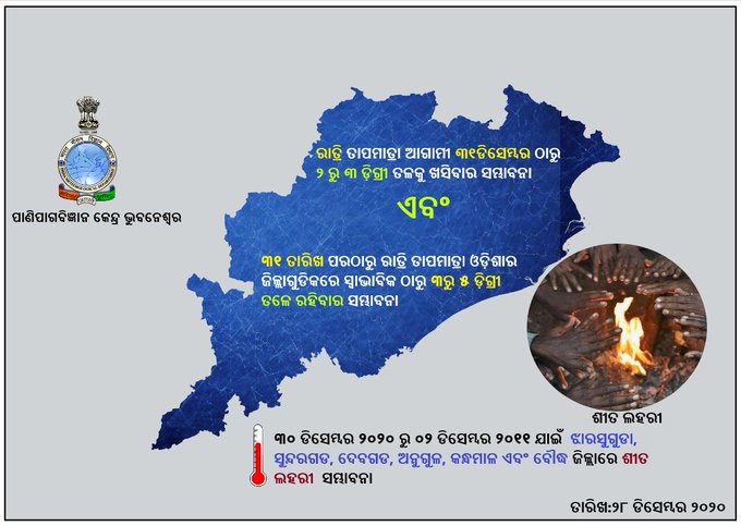 ରାଜ୍ୟନେ ଜାରି ରହିଛେ ଶୀତ୍ । ରାତି ପାରା କମବାର ସାଙ୍ଗେ ବଢୁଛେ ଜାଡ୍ । ଗଲା କିଛି ଦିନ୍ ଧରିକିନା ଲାଗି ରହିଥିବାର ଥଣ୍ଡା ଇହାଦେ ଫେର୍ ବଢେଇଛେ ମୁସ୍କିଲ୍ । ଆଗକେ ଆହୁରି ପାଂଚ ଦିନ୍ ପାଗ୍ ଏନ୍ତା ସମାନ୍ ରହେବା ଆରୁ ବେଶୀ କିଛି ପରିବର୍ତ୍ତନ୍ ନାଇଁ ଆସେ ବଲି ପାଣିପାଗ ବିଭାଗ ଆଡୁ କୁହାଯାଇଛେ । ଆଏବାର ୩୧ ଆରୁ ଜାନୁଆରୀ ୧ ତାରିଖ୍ ଆଡକେ ଆହୁରି ଜୋର୍ ଥଣ୍ଡା ବଢବାର ନେଇକରି ସୂଚନା ରହିଛେ । ଡିସେମ୍ବର ୩୦ ତାରିଖ୍ ତକ୍ ରାଜ୍ୟର କଟକ, ଜଗତସିଂହପୁର, ଖୋର୍ଦ୍ଧା, ନୟାଗଡ଼, କନ୍ଧମାଳ, ରାୟଗଡ଼ା, କୋରାପୁଟ, ମାଲକାନଗିରି ଆର କଳାହାଣ୍ଡି ଜିଲ୍ଲାନେ କୁହୁଡିଆ ପାଗ୍ ରହେବାର ସମ୍ଭାବନା ଅଛେ । ସେନ୍ତା ଆଏବାର ୩୧ ତାରିଖ ରାତିନୁ ରାଜ୍ୟର ଝାରସୁଗୁଡ଼ା, ସୁନ୍ଦରଗଡ଼, ଦେବଗଡ଼, ଅନୁଗୁଳ, ବୌଦ୍ଧ, କନ୍ଧମାଳ ଜିଲ୍ଲା ମାନକେ ଥଣ୍ଡା ଆହୁରି ବଢବା । ଇ ସବୁ ଜିଲ୍ଲା ମାନକେ ୨ନୁ ୩ ଡିଗ୍ରୀ ତକ୍ ପାରା କମବା ରାତି । ଇ ସବୁ ଜିଲ୍ଲା ମାନକୁଁ ୟେଲୋ ୱାର୍ଣ୍ଣିଂ ଦିଆଯାଇଛେ ।